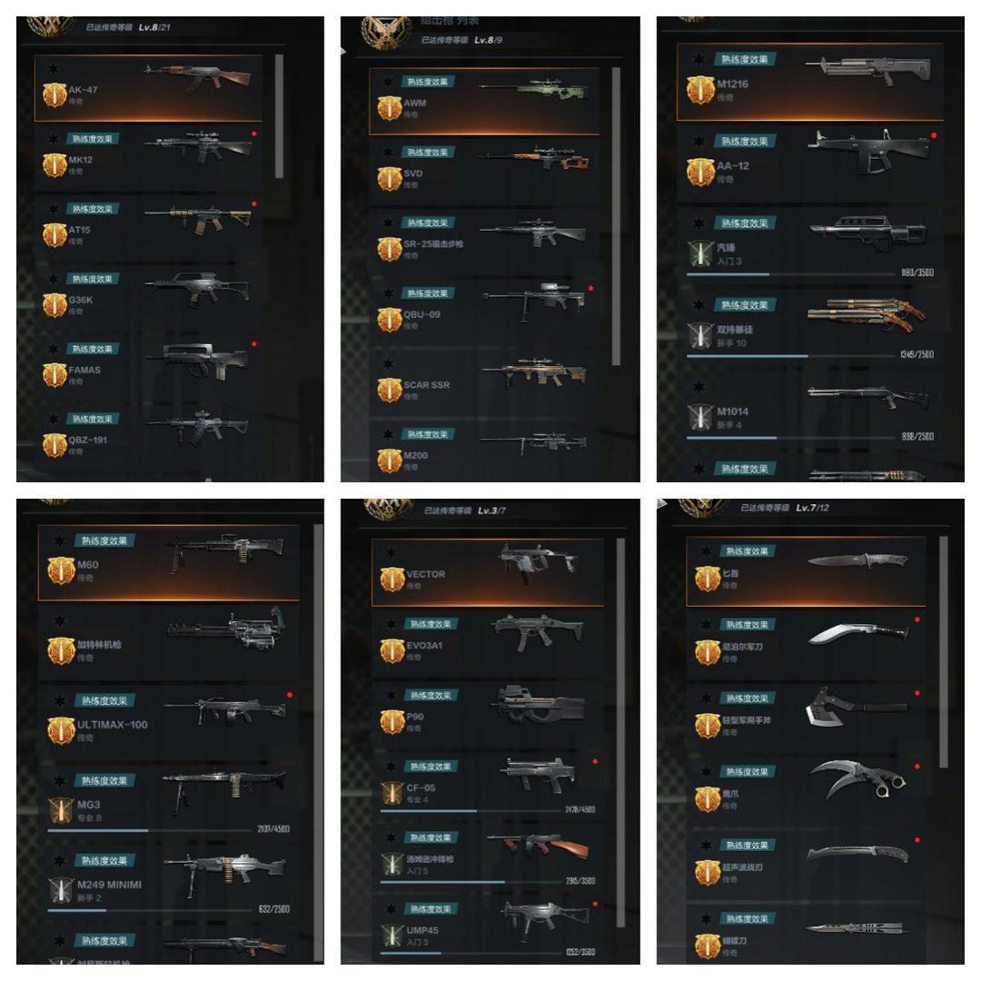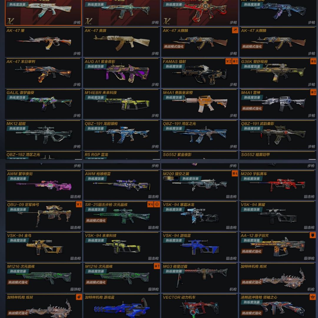 AK103远古神鹰4阶段 GALIL圣光轩辕4阶段 QBZ192混天神兵5阶段 AK103雷龙 AK47筞 AK47贵族 AK47火麒麟X2 AK47末日审判 AUGA1紫金夜影 FAMAS雷神 G36K望舒观澜 GALIL御梦幽葵 M14EBR未来科技 M4A1贵族皇家橙 M4A1雷神 MK12超能 QBZ191龙胆银枪 QBZ191湾区之光 QBZ191武韵秦影 QBZ192湾区之光 R5RGP雷龙 SG552紫金夜影 SG552暗黑铠甲 AWM繁华夜街 AWM枪娘格雷 M200猎空之翼 M200宇航赛车 QBU09定军神弓 SR25狙击步枪次元晶核 VSK94寒霜冰龙 VSK94黑曜 VSK94金乌 VSK94未来科技 VSK94游戏蓝 AA12原子毁灭 M1216次元晶核X2 MG3能量过载 加特林机枪炼狱 X2 加特林机枪游戏蓝 VECTOR动力机车 汤姆逊冲锋枪领袖之心