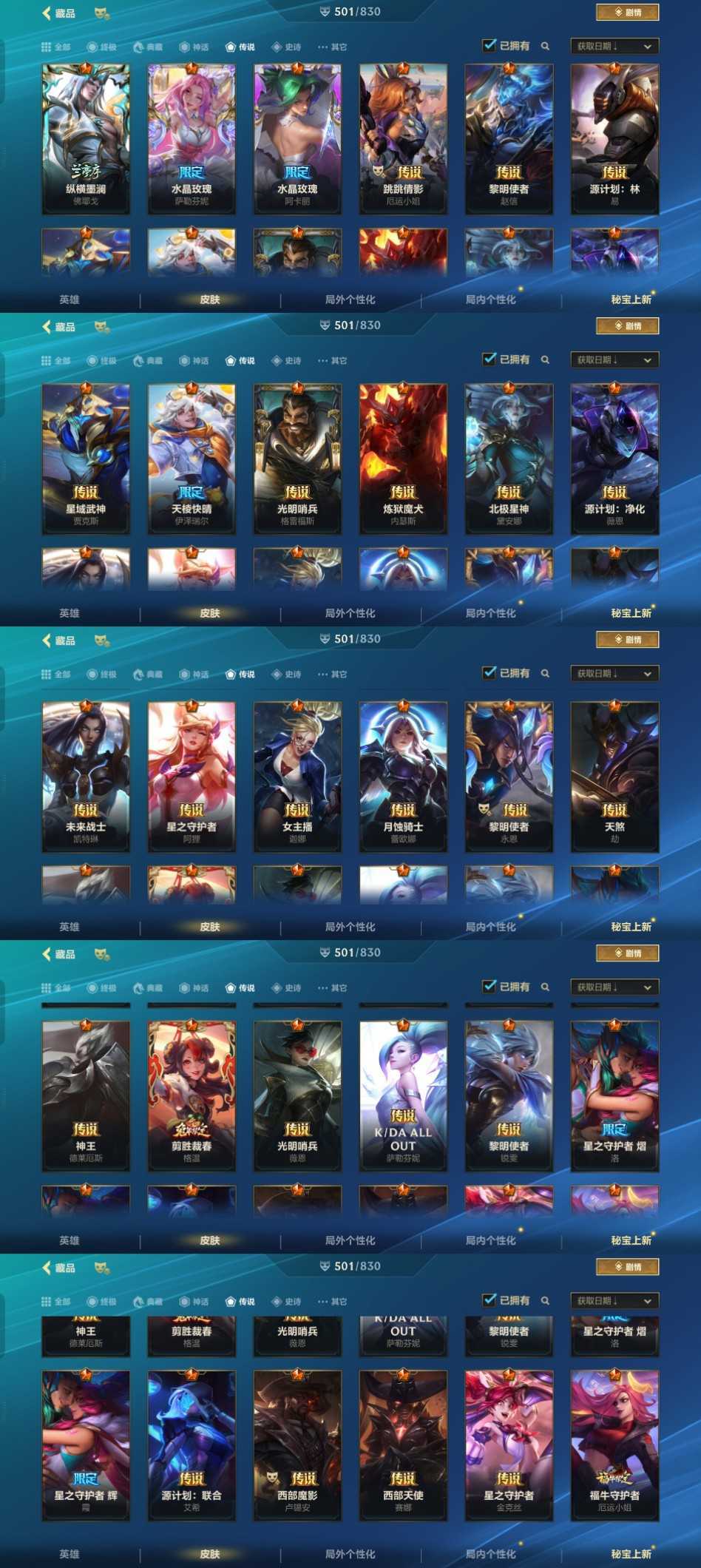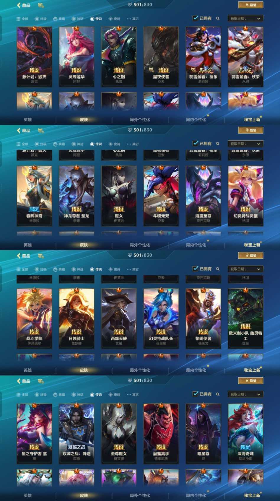 该号全英雄501皮,终极1个,神话10个,传说54个,千万不要挂机千万不要,挂机一律永久拉黑,上号时遇到上把对局未结束请麻烦帮忙结束对局,谢谢~