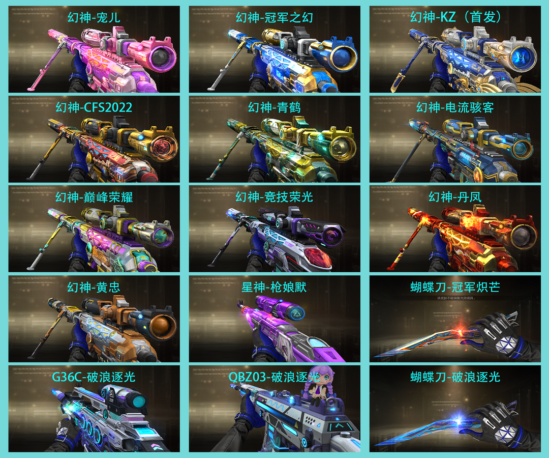 新增【幻神KZCFPLS25冠军,冠军蝶刃】幻神宠儿2021MVP,幻神电流骇客,幻神冠军之幻,幻神黄忠,幻神巅峰荣耀,幻神CFS2022,幻神青鹤,幻神丹凤,传说辉光,传说圣灵,炽芒蝶刃,蝴蝶刀,QBZ冠军之薇,柯尔特冠军之特,冠军之刃,HK417朱雀音效卡,ScarLight白虎音效卡,QBZ03金色蔷薇音效卡,极光音效卡,黑龙音效卡,裁决音效卡,幻神音效卡,火麒麟音效卡,雷神音效卡,毁灭音效卡,黑骑士音效卡,M200幻神音效卡,全音效卡,朱雀,白虎,玄武,青龙,Usp雷暴,COP堕天神,破空枪刃夜魔,柯尔特电竞装甲,柯尔特竞技荣光,USP神工天巧,柯尔特冠军之特,黄金猫猫手套白鲨,Kar98K星神,M200竞技荣光,雷神航星,qbz03冠军之薇,金色蔷薇枪娘阿敏,qbz03荣耀世冠白鲨,qbz03巅峰荣耀,金色蔷薇纸灯龙,星神枪娘默,黑龙冠军之武,AWM裁决百城联赛天津皮肤,雷神荣耀之魄,毁灭冠军之怒,毁灭SVCFPLS16冠军,火麒麟冠军之心,雷神冠军之魄,毁灭cfs2018,火麒麟cfs2018,毁灭AGcfpls15冠军雷神,宗师,大师,传奇,枪王,荣耀枪王,荣耀之巅,等等