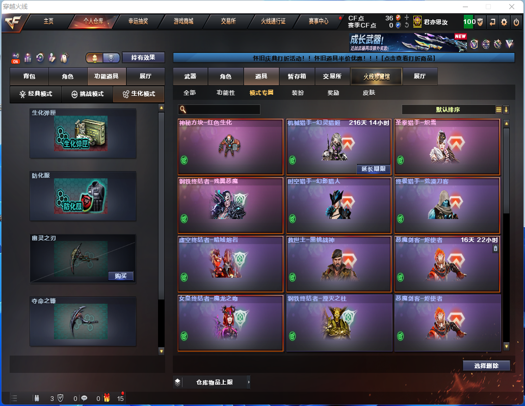 时空猎手✨16个生化皮肤✨斯泰尔蝴蝶小毒蜂✨四防生化背包✨炼狱带皮幻神可排位✨满榴弹不退包无炽芒蝶刃 ---2026年1月14日02:31:20-改