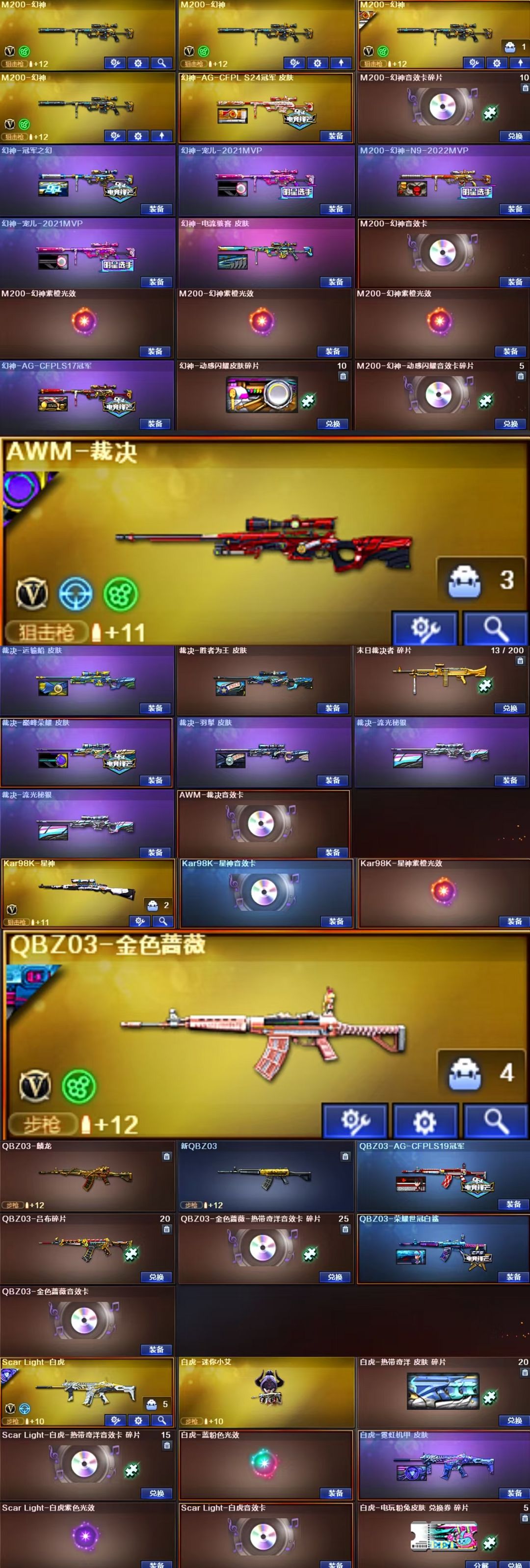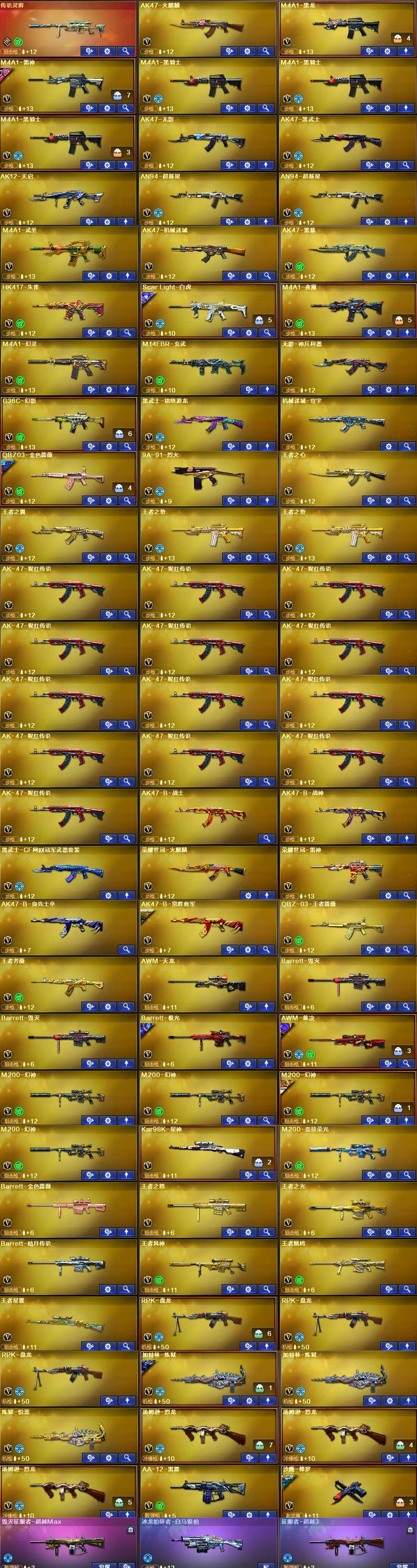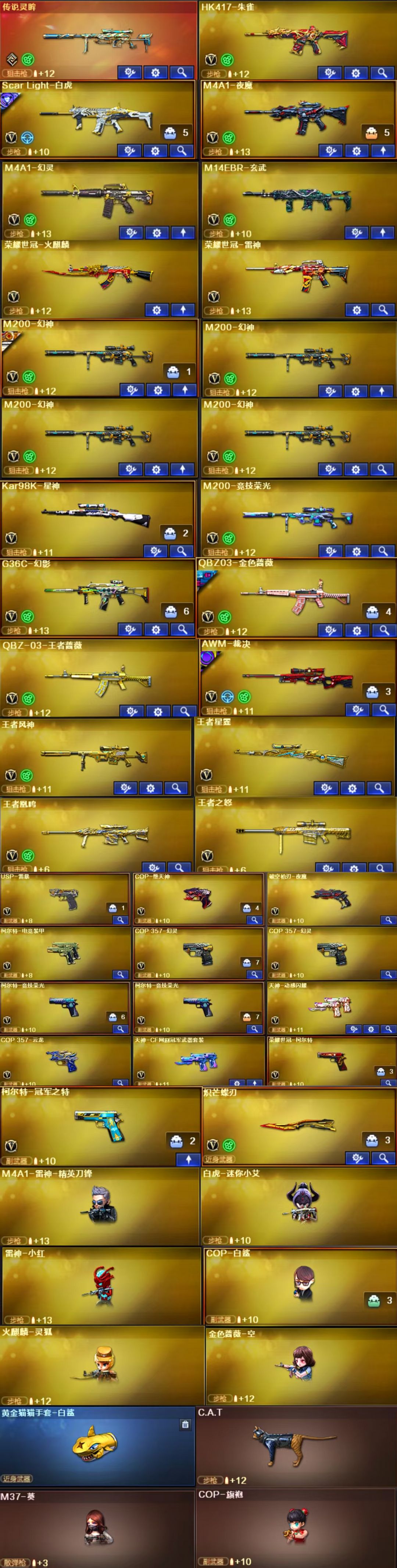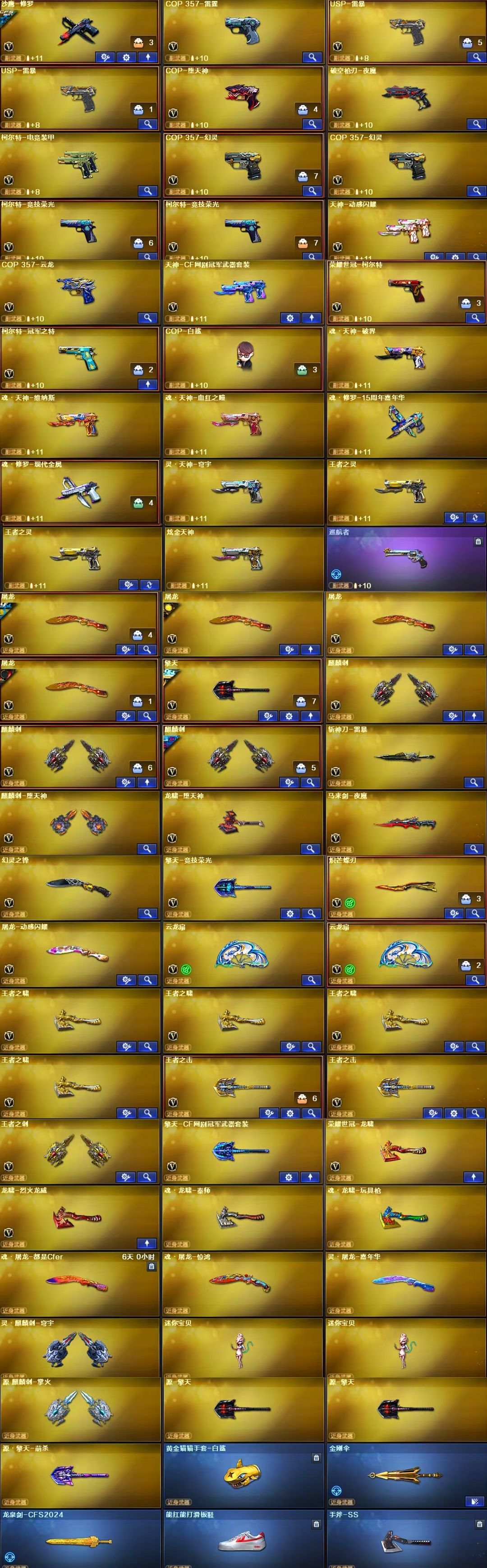 英雄武器:机械迷城-穹宇;云龙扇;COP 357-云龙;烟雾弹-云龙;高爆手雷-云龙;手雷-热带奇洋;汤姆逊-烈龙;闪光弹-云龙;黑武士-锦绣游龙;屠龙;炽芒蝶刃;柯尔特-冠军之特;G36C-幻影;AN94-超新星;传说灵眸;M14EBR-玄武;M200-幻神;Barrett-极光;龙啸-烈火龙威;天神-动感闪耀;屠龙-动感闪耀;手雷-动感闪耀;无影-神兵利器;M4A1-黑骑士;沙鹰-修罗;柯尔特-竞技荣光;闪光弹-竞技荣光;雷霆之契;烟雾弹-竞技荣光;高爆手雷-竞技荣光;擎天-竞技荣光;M200-竞技荣光;Scar Light-白虎;闪光弹-幻灵;烟雾弹-幻灵;高爆手雷-幻灵;COP 357-幻灵;M4A1-幻灵;幻灵之锋;AK47-B-常胜