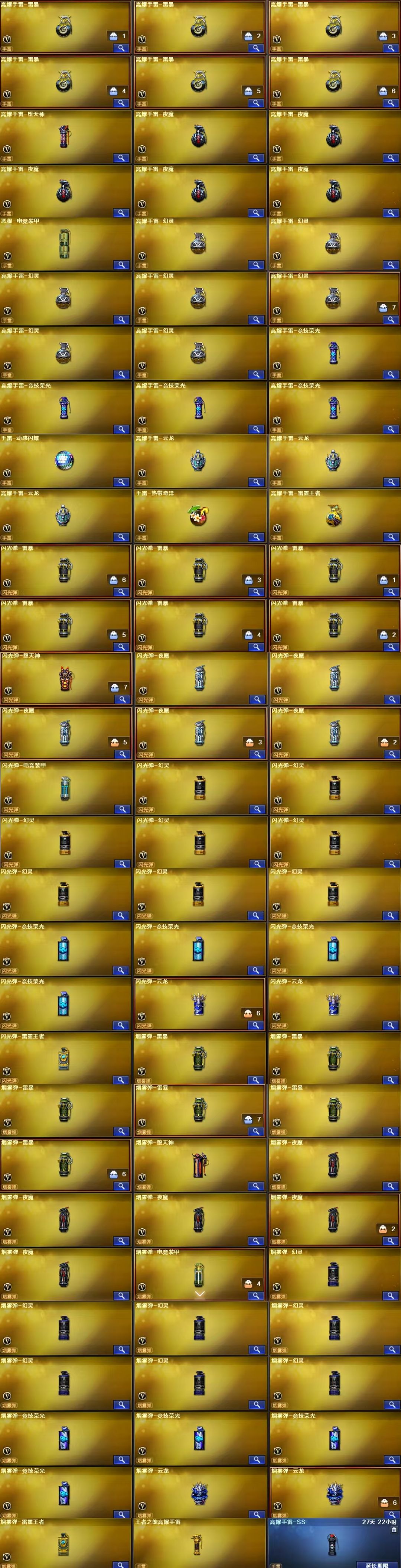 王者武器:王者雷影;王者星霆;烟雾弹-雷霆王者-觉醒版;高爆手雷-雷霆王者;闪光弹-雷霆王者-觉醒版;王者之翼-觉醒版;炼狱-悦蓝-觉醒版;QBZ-03-王者蔷薇-觉醒版;炫金天神;王者之势-觉醒版;王者之刺-觉醒版;王者之心-觉醒版;王者之啸-觉醒版;王者之击-觉醒版;王者之魄高爆手雷;王者之光-觉醒版;炫金火麒麟;王者之灵;王者之怒-觉醒版