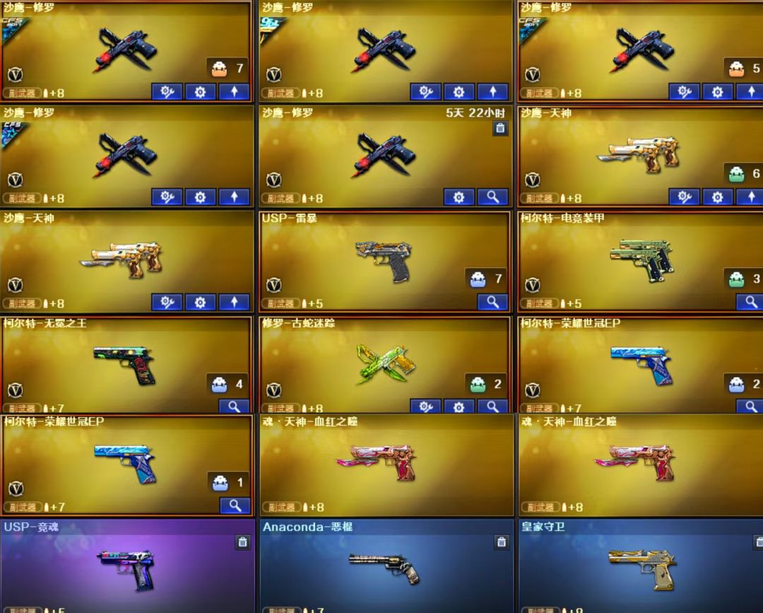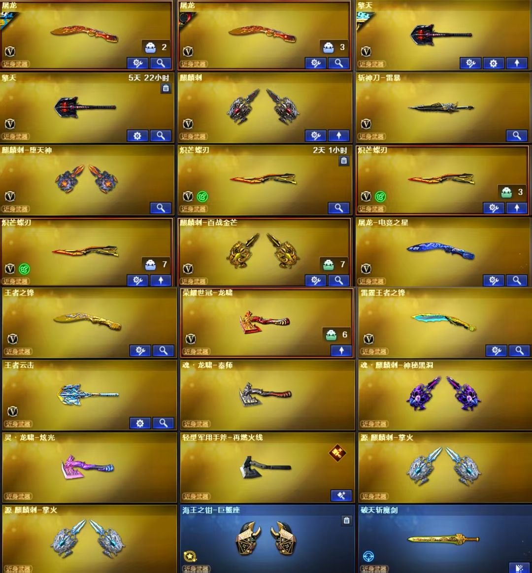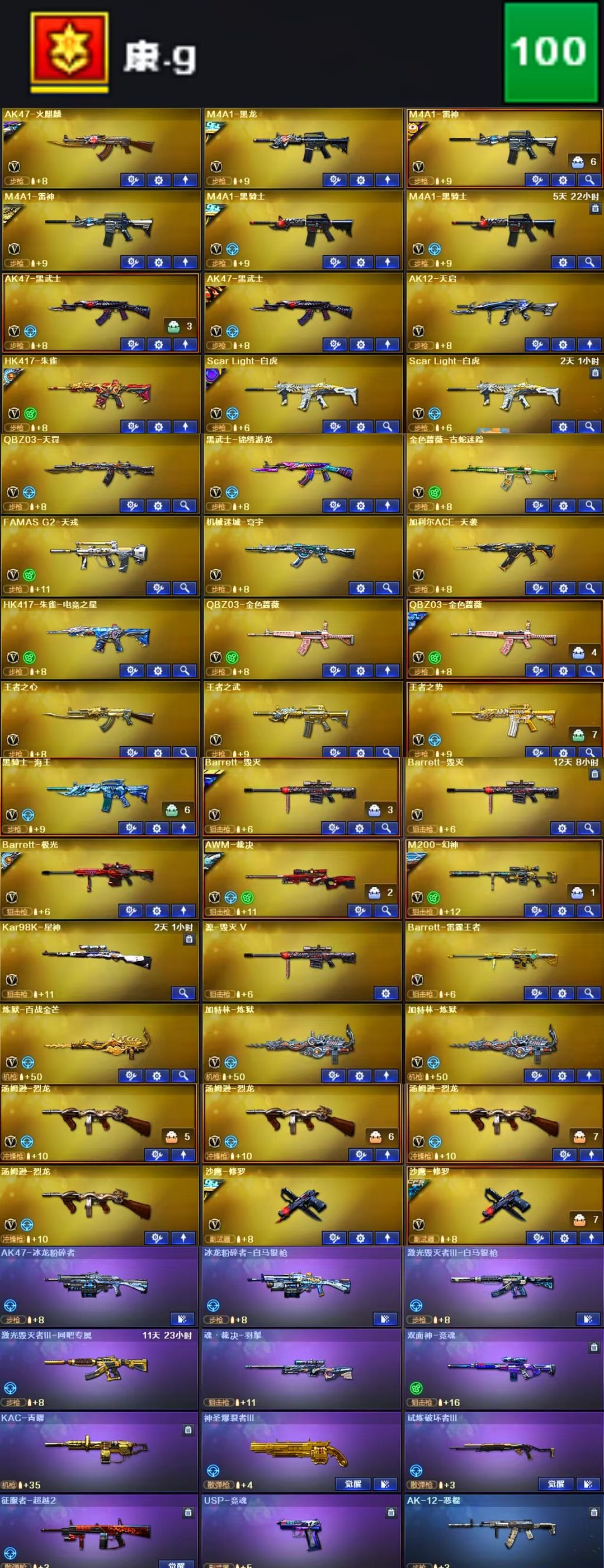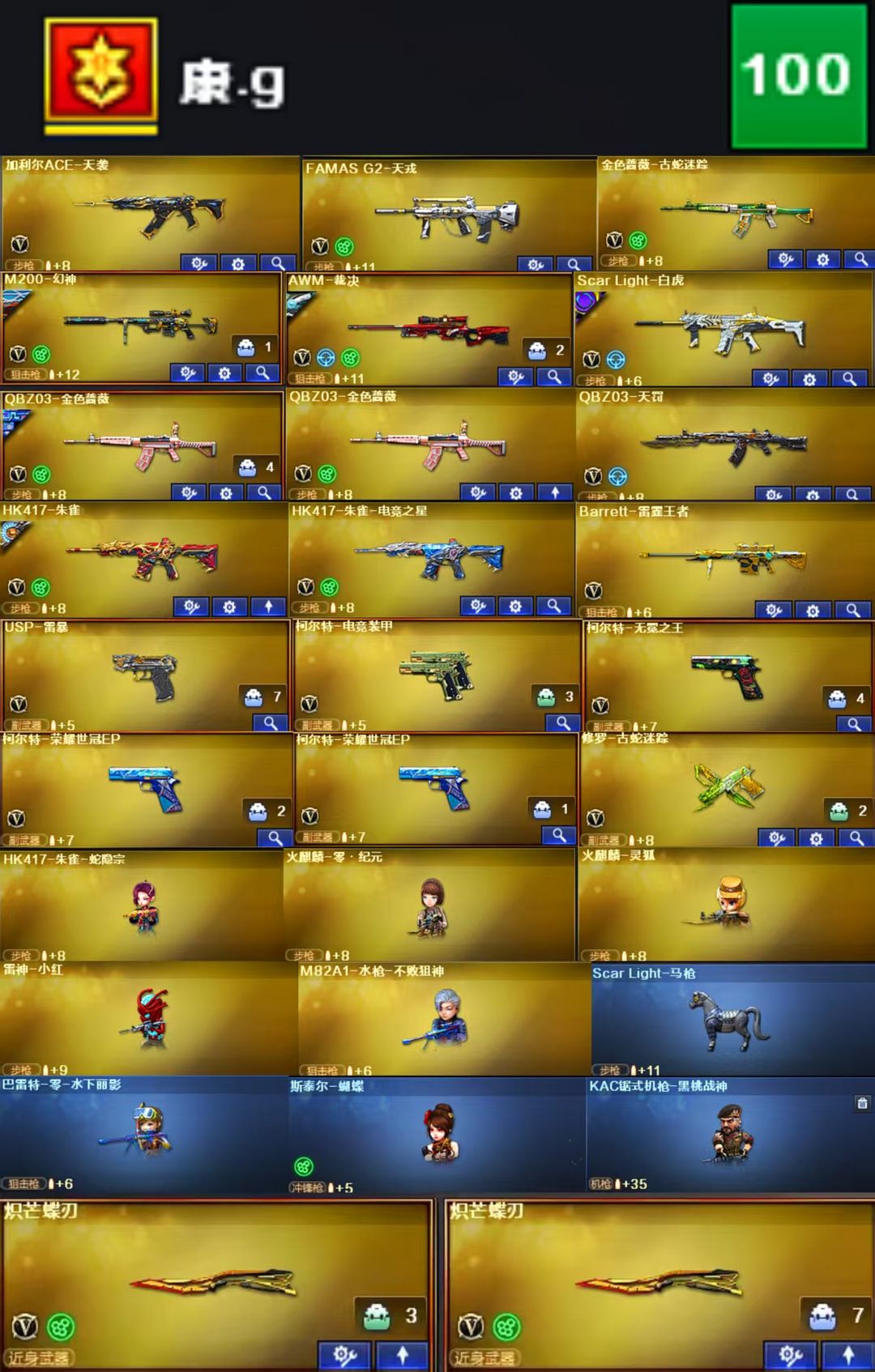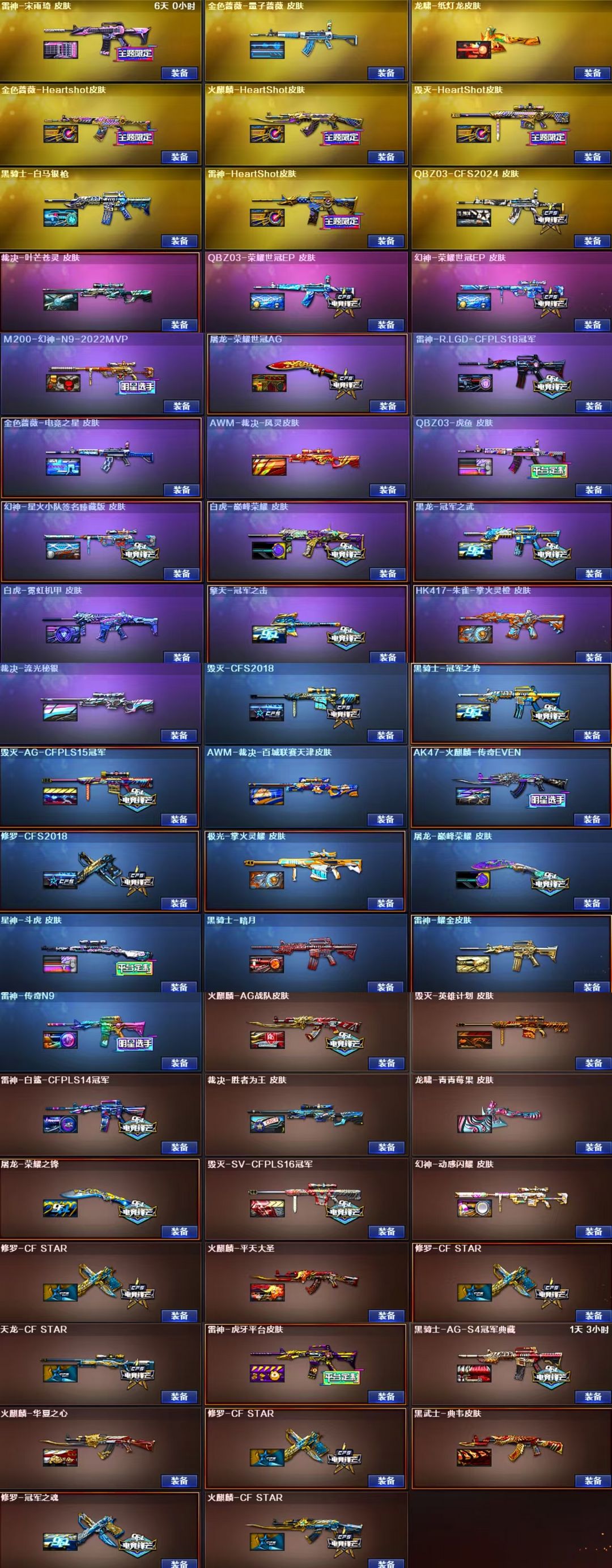 英雄武器:M4A1-黑骑士;擎天;沙鹰-修罗;炽芒蝶刃;Scar Light-白虎;Kar98K-星神;Barrett-毁灭;屠龙;黑骑士-海王;Barrett-碧霄极光;闪光弹-玄豹;机械迷城-穹宇;闪光弹-堕天神;FAMAS G2-天戎;沙鹰-天神;QBZ03-天罚;M4A1-黑龙;QBZ03-金色蔷薇;炽芒蝶刃;M4A1-雷神;柯尔特-无冕之王;荣耀世冠-龙啸;AWM-裁决;汤姆逊-烈龙;AK12-天启;沙鹰-修罗;黑武士-锦绣游龙;麒麟刺-堕天神;烟雾弹-堕天神;高爆手雷-堕天神;柯尔特-电竞装甲;烟雾弹-电竞装甲;恶棍-电竞装甲;闪光弹-电竞装甲;Barrett-极光;麒麟刺;Scar Light-白虎;AK47-火麒麟;HK417-朱雀;擎天;USP-雷暴;高爆手雷-雷暴;烟雾弹-雷暴;闪光弹-雷暴;加特林-炼狱;AK47-黑武士;斩神刀-雷暴;M200-幻神