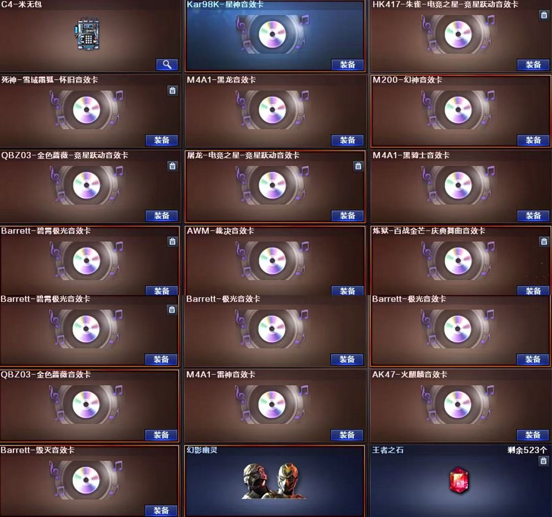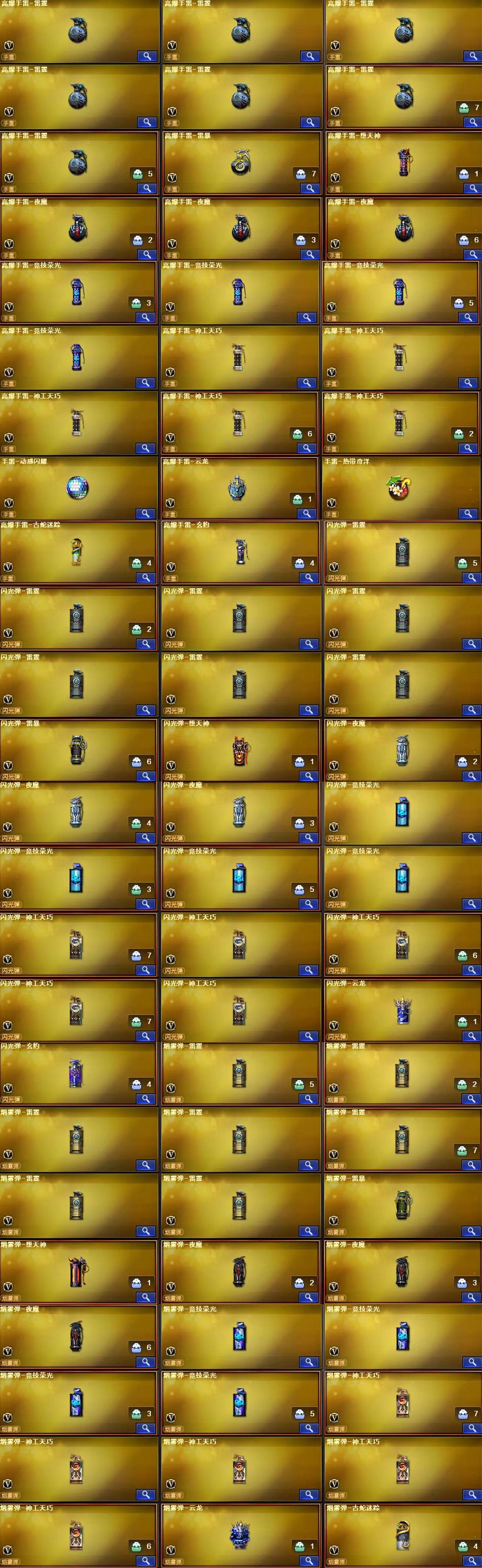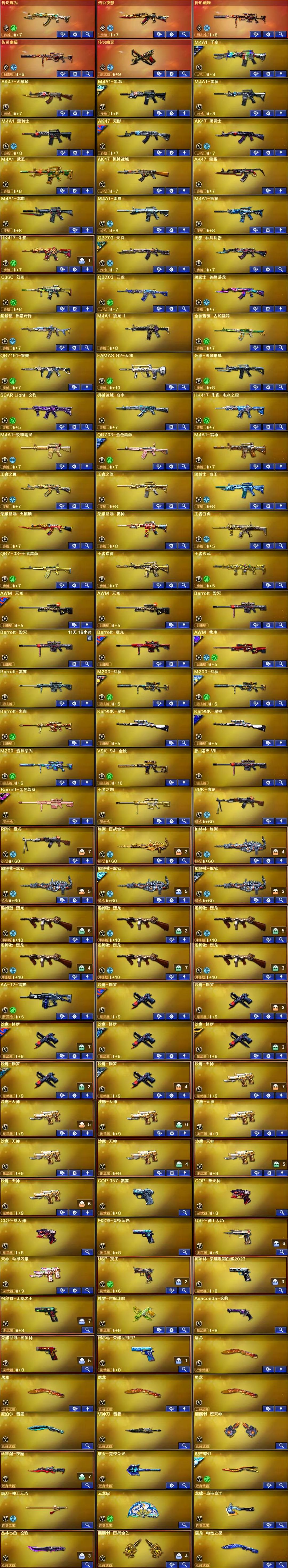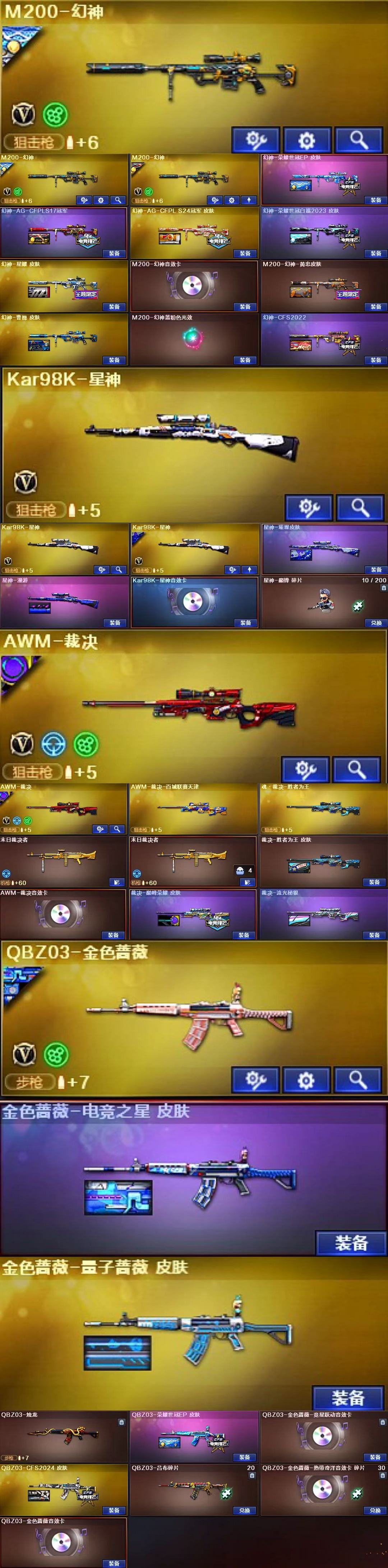 王者武器:王者玄武;王者冰锋;QBZ-03-王者蔷薇-觉醒版;天启-悦智;王者之心-觉醒版;王者白虎-觉醒版;王者之魄-觉醒版;王者之怒-觉醒版;王者之戮;王者之翼-觉醒版;炫金武士;王者之武;王者之幻;炫金骑士;炫金天神;炫金修罗;炫金黑龙;炫金无影