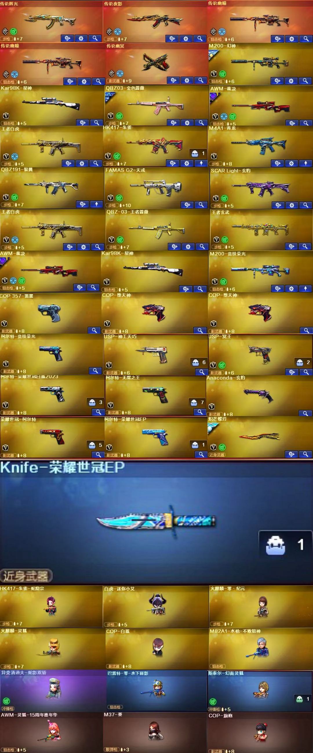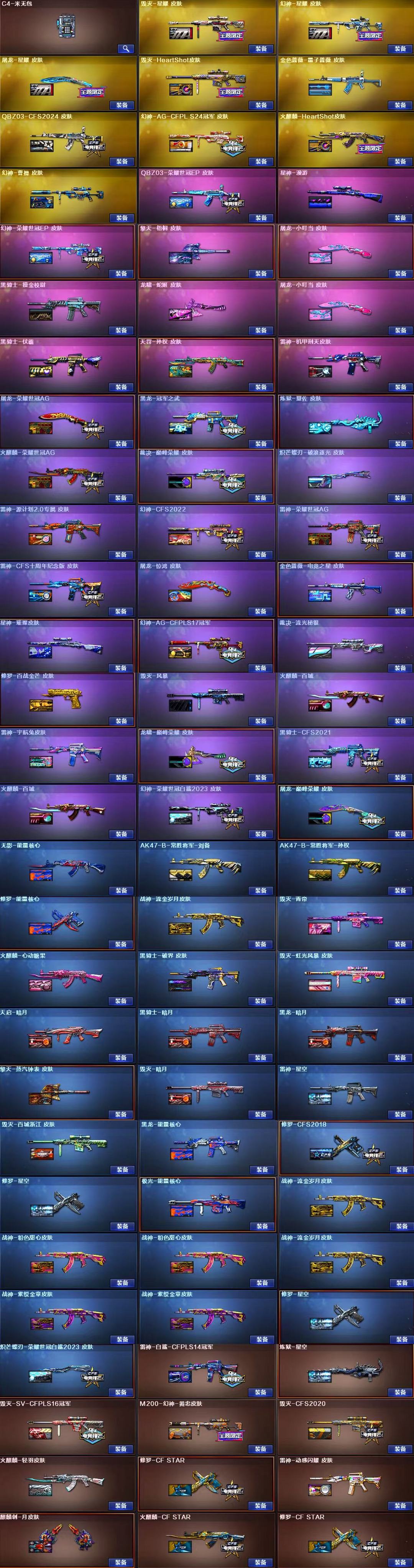 英雄武器:Barrett-毁灭;Barrett-碧霄极光;龙啸-烈火龙威;加特林-炼狱;USP-冥王;闪光弹-玄豹;烟雾弹-玄豹;高爆手雷-玄豹;SCAR Light-玄豹;丛林匕首-玄豹;Anaconda-玄豹;机械迷城-穹宇;M4A1-猎神;沙鹰-天神;QBZ03-天罚;FAMAS G2-天戎;柯尔特-荣耀世冠白鲨2023;G36C-幻影;M200-幻神;传说幽冥;传说幽瞳;Kar98K-星神;屠龙;传说辉光;传说夜影;黑骑士-海王;麒麟刺;M4A1-雷神;炽芒蝶刃;M200-竞技荣光;M4A1-黑骑士;柯尔特-无冕之王;擎天;荣耀世冠-龙啸;荣耀世冠-柯尔特;荣耀世冠-火麒麟;荣耀世冠-雷神;超新星-热带奇洋;龙啸-热带奇洋;手雷-热带奇洋;AK47-机械迷城;闪光弹-云龙;烟雾弹-云龙;云龙扇;高爆手雷-云龙;QBZ03-云龙;