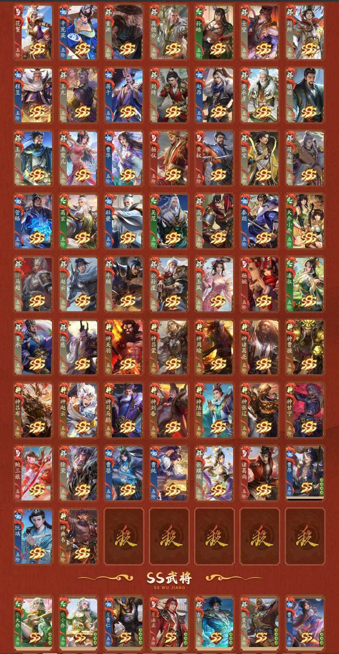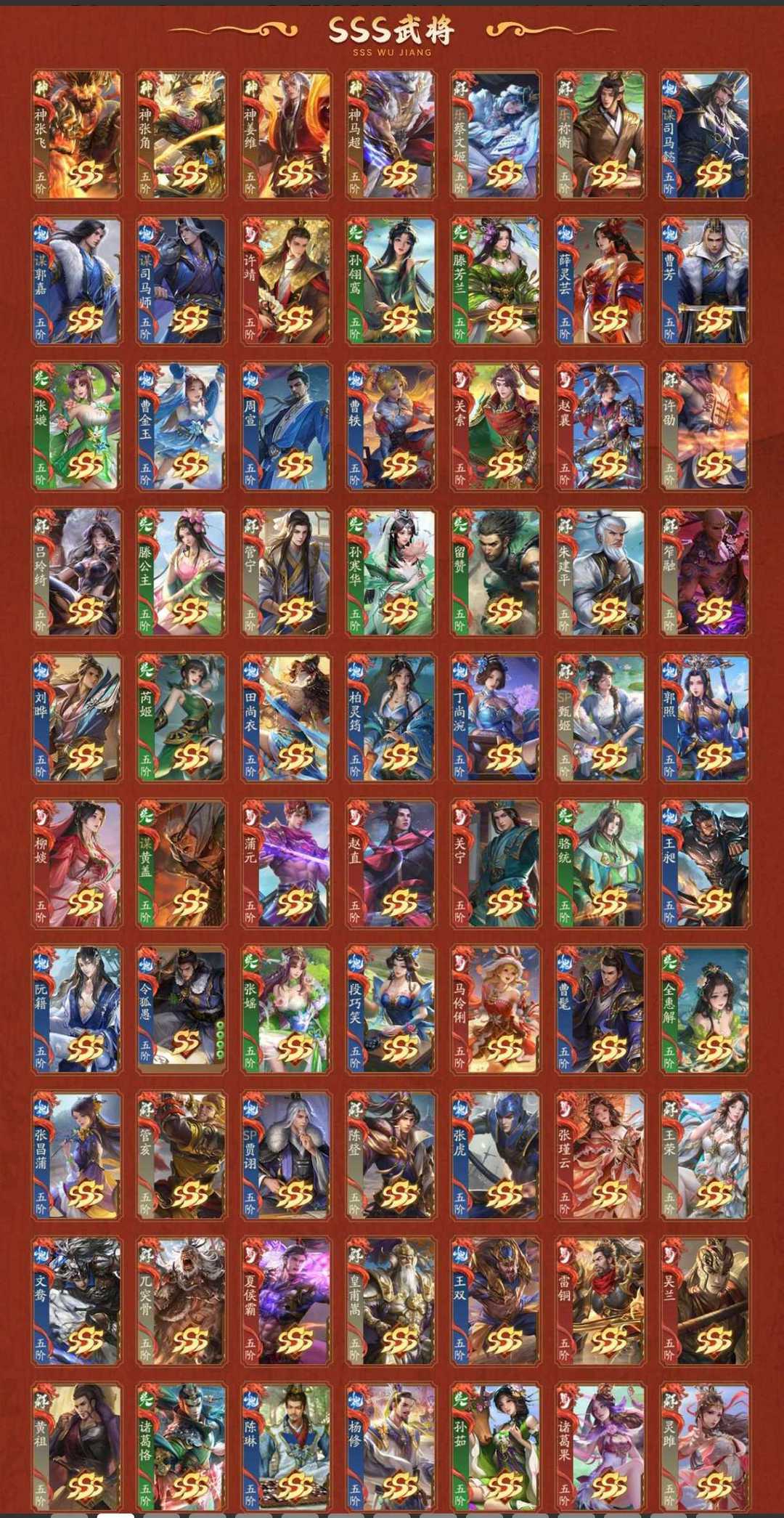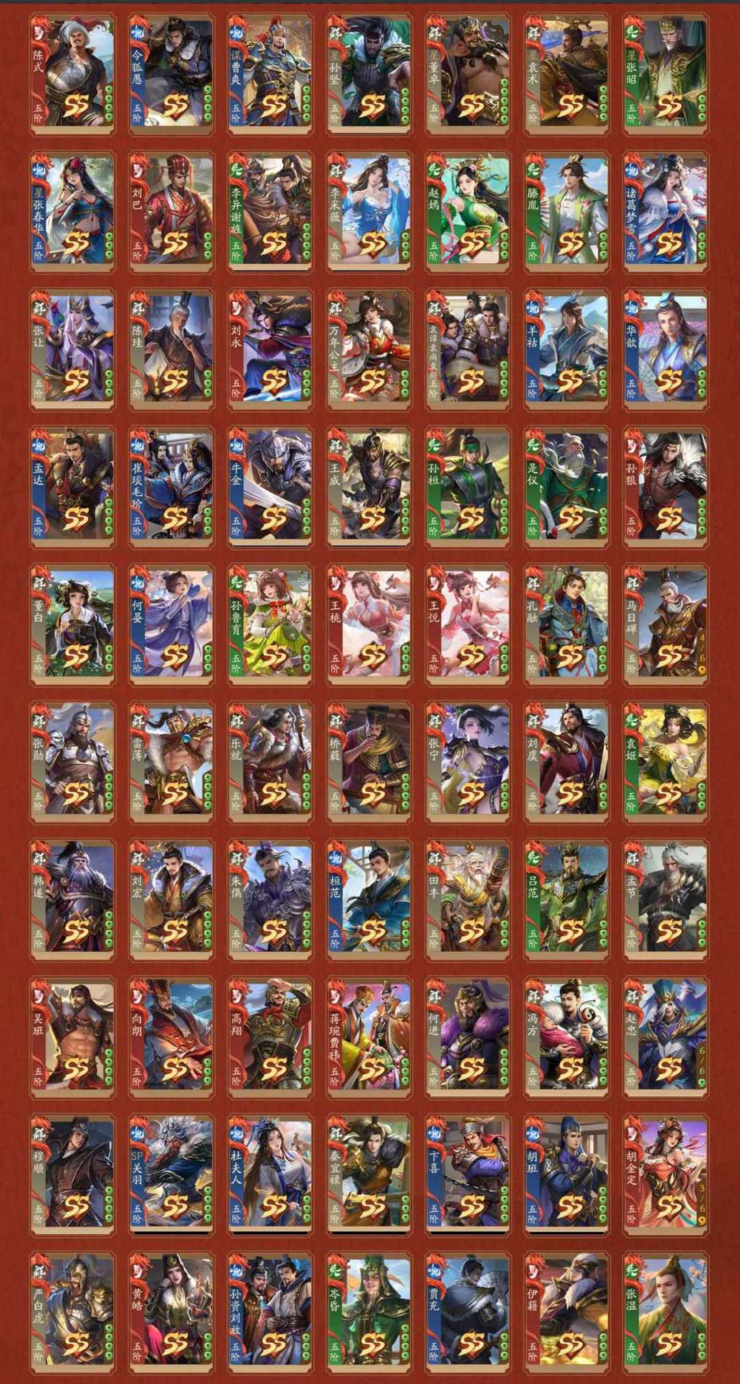 谋司马懿谋郭嘉谋司马师+神马超(惊雷动)神张飞(山河动)神张角(震泽静)+许靖(丹枫动+双传)乐祢衡乐蔡文姬(限)孙翎鸾薛灵芸(金蛟动)笮融周宣(限)朱建平(传)SP甄姬田尚衣(传)柏灵筠(传)曹芳曹轶(传)曹宪(限动)星曹仁孙寒华张嫙(限)曹金玉(青花瓷动)刘晔芮姬(双传)丁尚涴(传)吕玲绮(冰魄动)许劭(水龙静+声名动)郭照(青花瓷静)管宁吉平(传)乐大乔(传)乐小乔(传)陈式关索(限+传)赵襄(至臻动)
