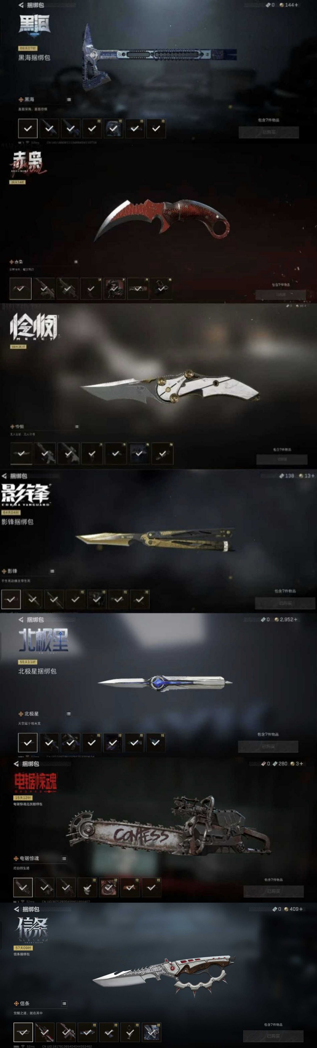 皮肤号 满红皮满刀皮+龙牙信条北极星影锋赤枭怜悯黑海电锯惊魂捆绑包+维什戴尔能天使午夜邮差黑天际线水墨云图