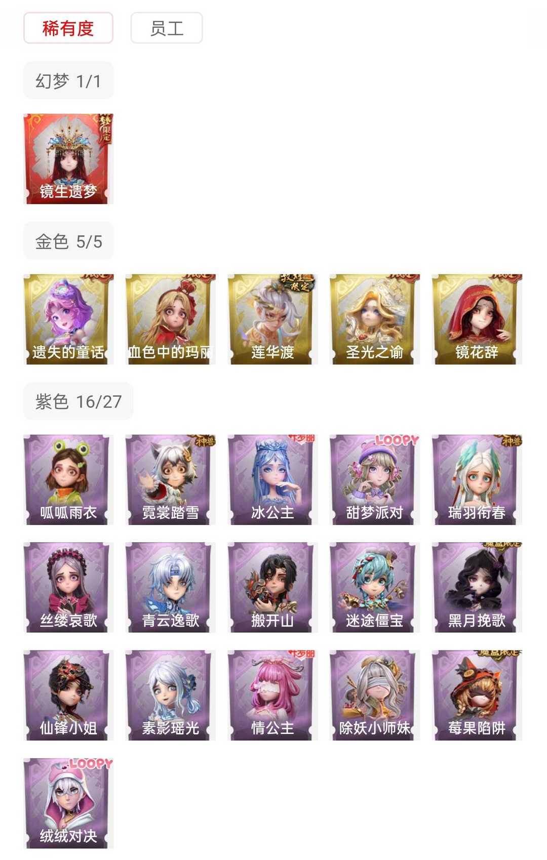 【紫色皮肤】艾伦-黎明猎手、兰-千夜星谕、零-搬开山、爱丽丝-甜梦派对、莉莉-莓果陷阱、莉莉-除妖小师妹、薇薇安-黑月挽歌、阿念-王子与骑士、莉莉-情公主、小黄-罗丽、爱丽丝-瑞羽衔春、小黄-霓裳踏雪、零-青云逸歌、巫铃儿-素影瑶光、爱丽丝-丝缕哀歌、逍遥-绣春逍影、小黄-呱呱雨衣