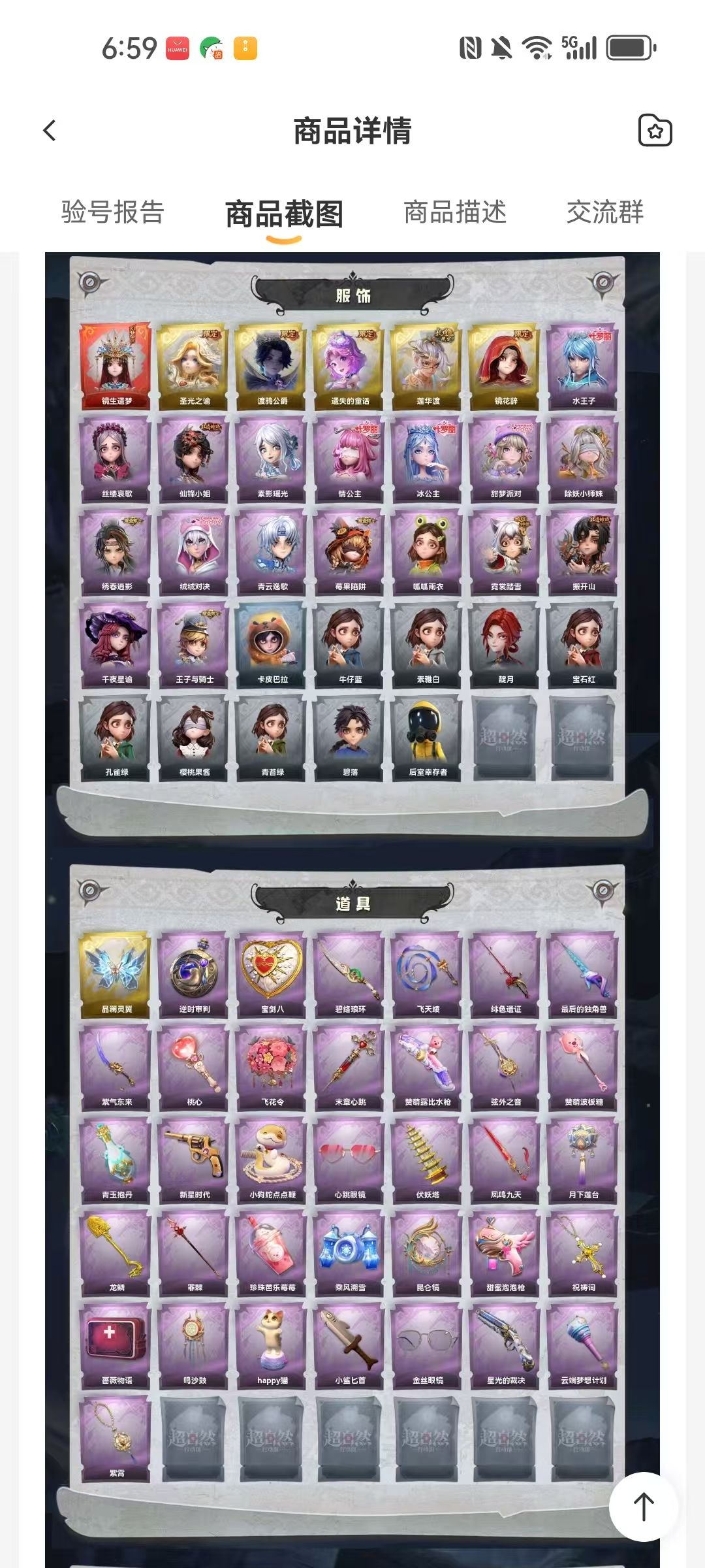 巫铃儿-镜生遗梦,薇薇安-圣光之谕,零-渡鸦公爵,小黄-遗失的童话,逍遥-莲华渡,巫铃儿-镜花辞,艾伦-水王子,爱丽丝-丝缕哀歌,薇薇安-仙锋小姐,巫铃儿-素影瑶光,莉莉-情公主,爱丽丝-冰公主,爱丽丝-甜梦派对,莉莉-除妖小师妹,逍遥-绣春逍影,艾伦-绒绒对决,零-青云逸歌,莉莉-莓果陷阱,小黄-呱呱雨衣,小黄-霓裳踏雪,零-搬开山,兰-千夜星谕,阿念-王子与骑士;道具:喷气背包-晶澜灵翼,传送按钮-逆时审判,腰包-宝剑八,刺刀-碧络琅环,长鞭-飞天绫,桃木剑-绯色遗证,桃木剑-最后的独角兽,刺刀-紫气东来,荧光棒-桃心-荧光棒-桃心,额外的背包-飞花令,急救包-末章心跳,短管猎枪-赞萌露比水枪,除颤仪-弦外之音,铲子-赞萌波板糖,黄牛能量饮料-青玉抱丹,转轮手枪-新星时代,长鞭-小狗蛇点点鞭,夜视仪-心跳眼镜,葫芦-伏妖塔,桃木剑-凤鸣九天,腰包-月下莲台,铲子-龙鳞,长枪-罪棘,黄牛能量饮料-珍珠芭乐莓莓,喷气背包-乘风溯雪,传送按钮-昆仑镜,电击枪-甜蜜泡泡枪,摸金符-祝祷词,急救包-蔷薇物语,音响-鸣沙鼓,音响-happy猫,刺刀-小鲨匕首,夜视仪-金丝眼镜,短管猎枪-星光的