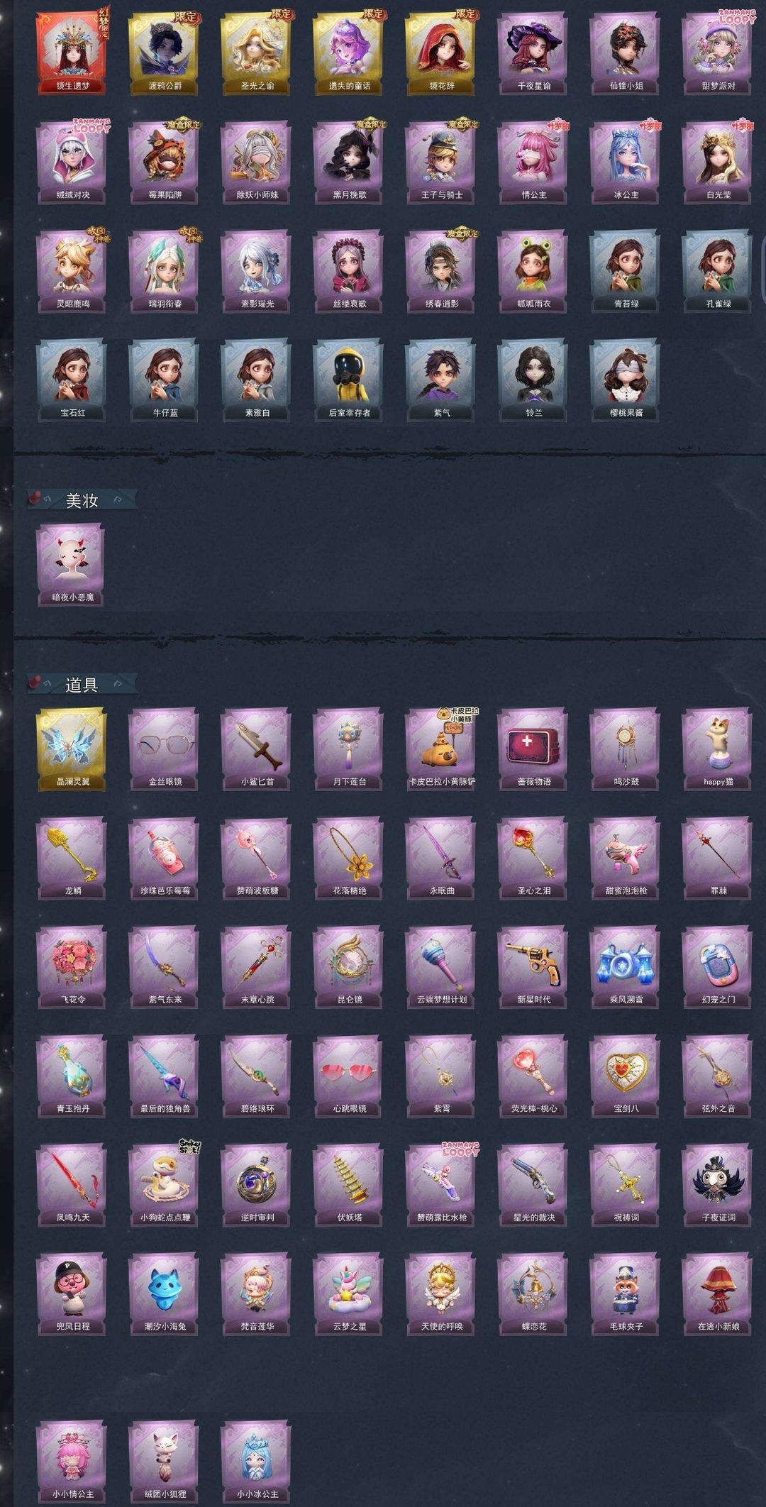 【道具皮肤】喷气背包-晶澜灵翼、夜视仪-金丝眼镜、刺刀-小鲨匕首、腰包-月下莲台、铲子-卡皮巴拉小黄豚铲、急救包-蔷薇物语、音响-鸣沙鼓、音响-happy猫、铲子-龙鳞、黄牛能量饮料-珍珠芭乐莓莓、铲子-赞萌波板糖、摸金符-花落精绝、桃木剑-永眠曲、铲子-圣心之泪、电击枪-甜蜜泡泡枪、额外的背包-飞花令、刺刀-紫气东来、急救包-末章心跳、传送按钮-昆仑镜、专业手电-云端梦想计划、转轮手枪-新星时代、喷气背包-乘风溯雪、传送按钮-幻宠之门、黄牛能量饮料-青玉抱丹、桃木剑-最后的独角兽、刺刀-碧络琅环、夜视仪-心跳眼镜、摸金符-紫霄、腰包-宝剑八、除颤仪-弦外之音、桃木剑-凤鸣九天、长鞭-小狗