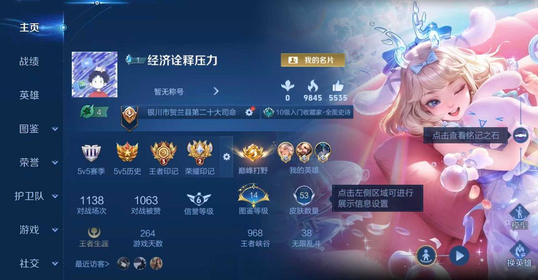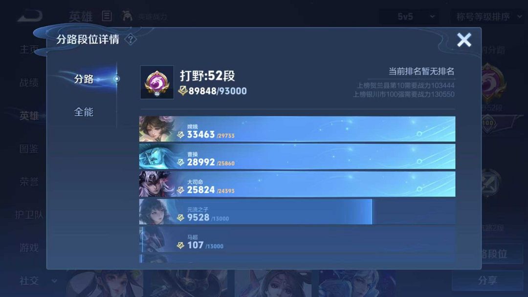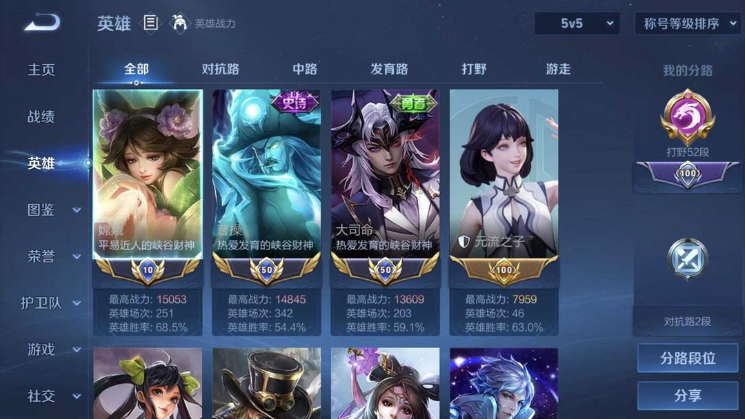本游戏账号: V5用户,基础段位:最强王者,英雄虽然少,应该有你喜欢的英雄。,皮肤目前不多,希望有你喜欢的。 私人所属英雄皮肤有:张良 黄金白羊座||桑启 鸣野蒿西施 续相思||女娲 愿照·千秋盛||赵云 皇家上将||鲁班大师 乓乓大师||项羽 海滩派对||狄仁杰 阴阳师不知火舞 魅语||阿轲 节奏热浪||李元芳 逐浪之夏||孙尚香 水果甜心||西施 诗语江南||海月 浮梦罗烟,等等