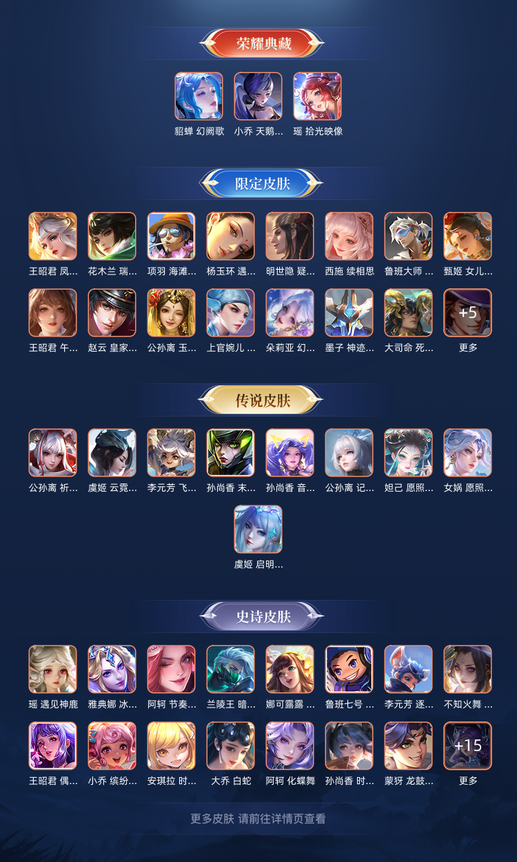 场次都是女生英雄哦 典藏貂蝉幻阙歌,天鹅之梦,时光影像。 落雪白狼,雪兔子+fmvp+记忆之芯,大司命死亡执政官,女娲妲己蛇限,香香音你和星传说,小动物乐园,飞鸢探春,海月传说,王昭君映山客乞巧织情,甄姬至美,虞姬传说,西施游龙,情限。炽阳神光,霜月吟。 小乔有嗷呜小狼星元。还有很多漂亮史诗…… 可以排位,可以预约
