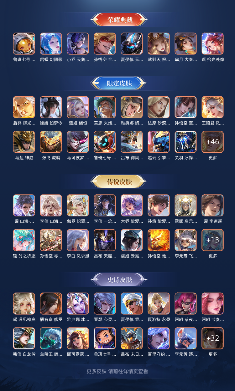 ,天魔缭乱/至尊宝/梅西/青龙志/白虎志/朱雀志/久胜战神/飞衡/群星魔术团(上官婉儿)/乘龙·问璇玑/群星魔术团(韩信)/时之祈愿瑶/李逍遥/群星魔术团(云中君)/琥珀纪元(马超)/幻阙歌/琥珀纪元(伽罗)/曦玄引(貂蝉)/乘龙·淬吴钩/拾光映像/乘龙·铭钟鼎/妄想实况/深海之息/黄金天蝎座/夜礼服假面/乘龙·聚宝船/神威/炽阳神光/启示之音/乘龙·忆丹青/青丘·九尾/鹤归松栖(云缨)/时之魔女/天魔缭乱/至尊宝/梅西/青龙志/白虎志/朱雀志/久胜战神/飞衡/群星魔术团(上官婉儿)/乘龙·问璇玑/群星魔术团(韩信)/时之祈愿瑶/李逍遥/群星魔术团(云中君)/琥珀纪元(马超)/幻阙歌/琥珀纪元(伽罗)/曦玄引(貂蝉)/乘龙·淬吴钩/拾光映像