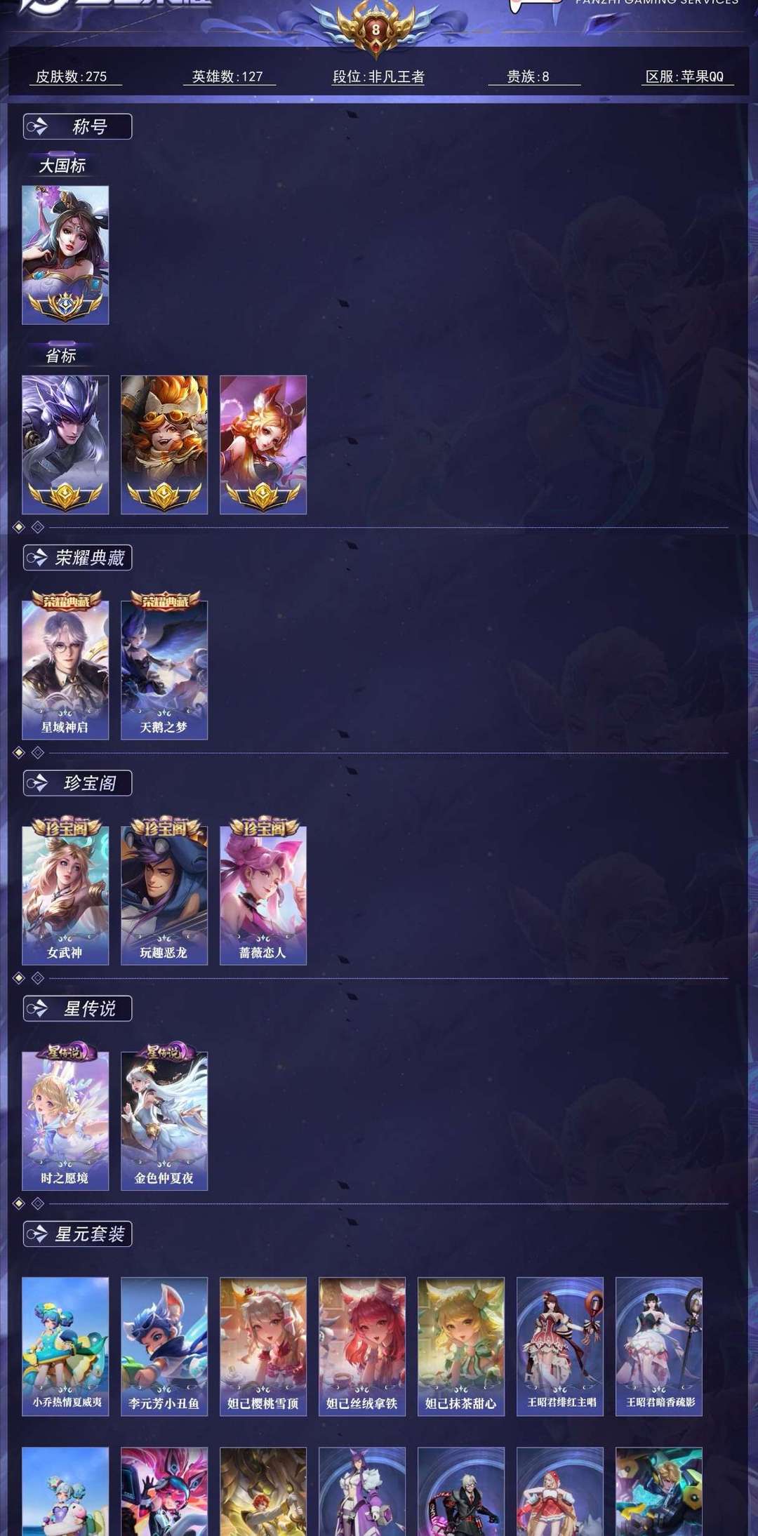 大国标貂蝉17000+战力,荣耀典藏两个,怪盗基德,星传说等等,另有很多万战,英雄全,皮肤畅玩!