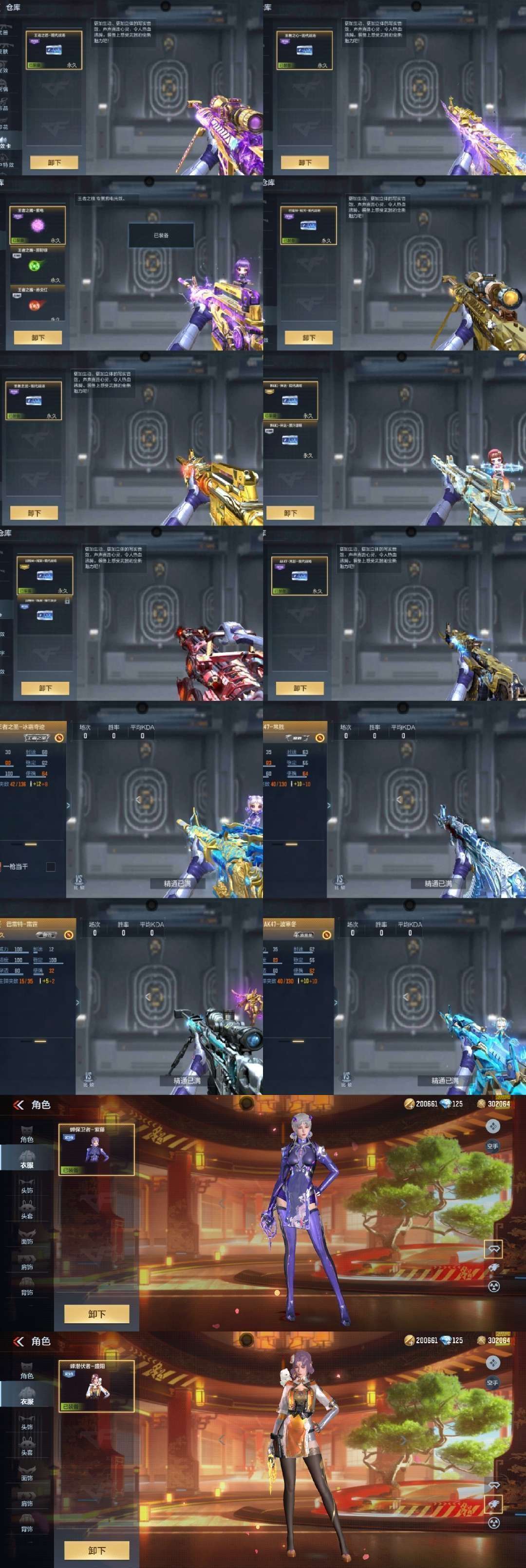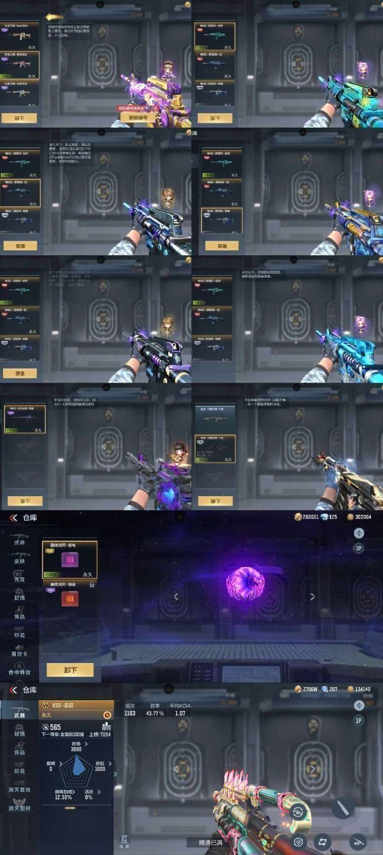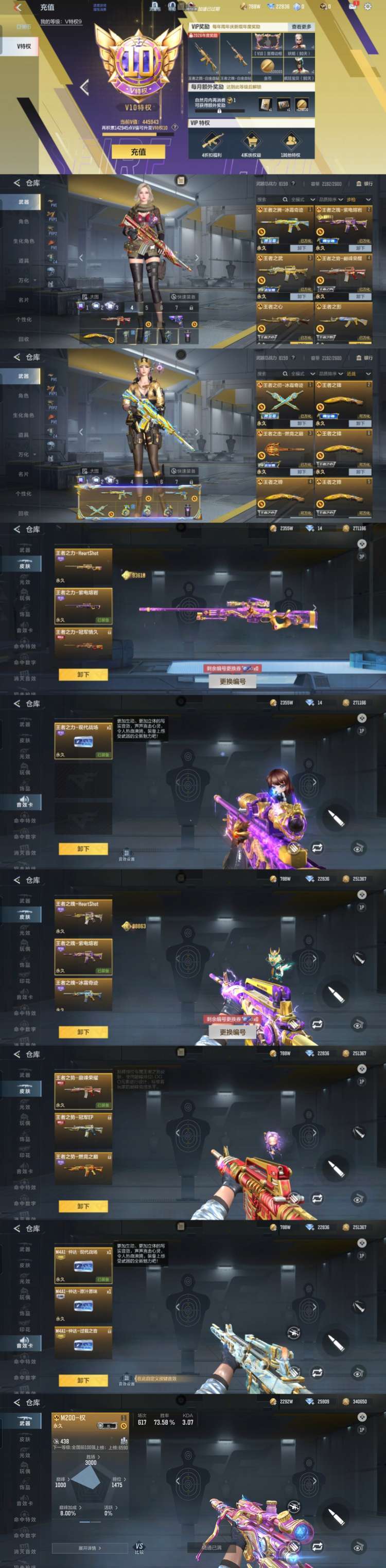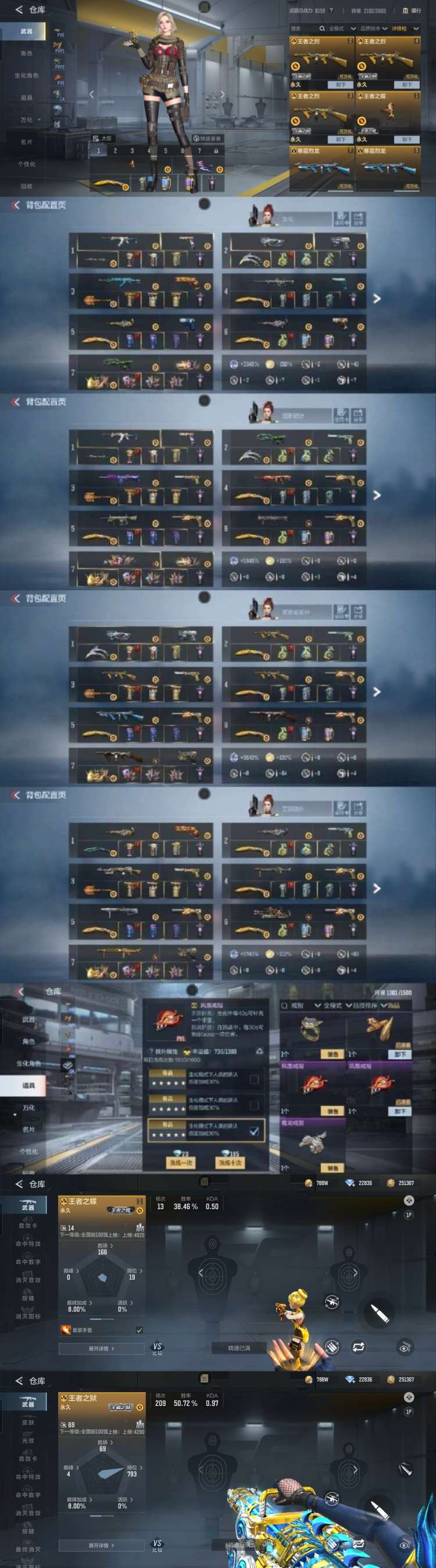 全自瞄:王势巅峰皮,黑耀宝葫芦全套,星象套装,仲达套装,竞界荣光套装,游骑兵。 游骑兵全皮肤:航轩,紫魇,枪娘,KZ,寒霜。 仲达满配:仲达白露皮肤,仲达过载皮肤,过载之源光线,仲达现代战场音效卡,仲达原汁原味音效卡,仲达过载玩偶,8张消灭音效卡。 生化满配:王蝶+6烈+炽芒蝶刃,宙斯套装+6神罚+6散弹,王狱+6神罚+6机枪(500发),双脊龙套装+6神罚+6烈龙,嗜血金鲨毒液皮肤。 角色:王者零,貂蝉,春,子涵,雅典纳,幻影逐日追风,水下丽影,职业经理,关小雨。