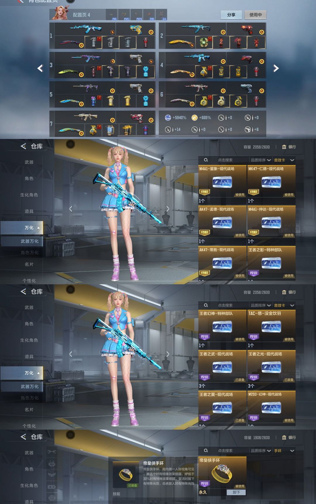 本游戏账号:英雄武器284个, 王者武器19个。军衔: 荣耀元首,段位: 枪皇S,拥有:香香,樱,关小雨,等11个角色。装备齐全让你拥有完美游戏初体验,特殊装备有:王者之轮、AN94-超新星、巴雷特-枪娘、黑武士手雷、源·AK47-黑武士、A180-地狱凤凰、81式-阿波罗、M4A1-竞技战魂、CZS2-心动次元觉醒、黑龙魂、雷霆、地狱烈炎、MK5-机械纪元、麒麟刺、巴雷特-定军、巴雷特-极光、M200-心动次元觉醒、王者之心手雷、M4A1-海骑士、AK47-心动次元、王者之心烟雾弹、墨刃-幻神、MK47-仁德、王者之势手雷、雷神闪光弹、M4A1-九尾狐、尼泊尔-机械纪元、烟雾弹-游骑兵、M200-幻神、MK23-机械纪元、黑武士烟雾弹、源·QCW05-变形金刚·大黄蜂、手斧-竞技战魂、98K-星神、QCW05-变形金刚·大黄蜂、王者之烈、AWM-游骑兵、COP 357-雷霆、闪光弹-游骑兵、斯泰尔-蝴蝶、王者幻神、VEPR12-本初、MK23-幻神、AK47-血武士、G36-机