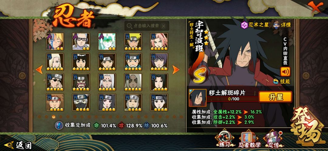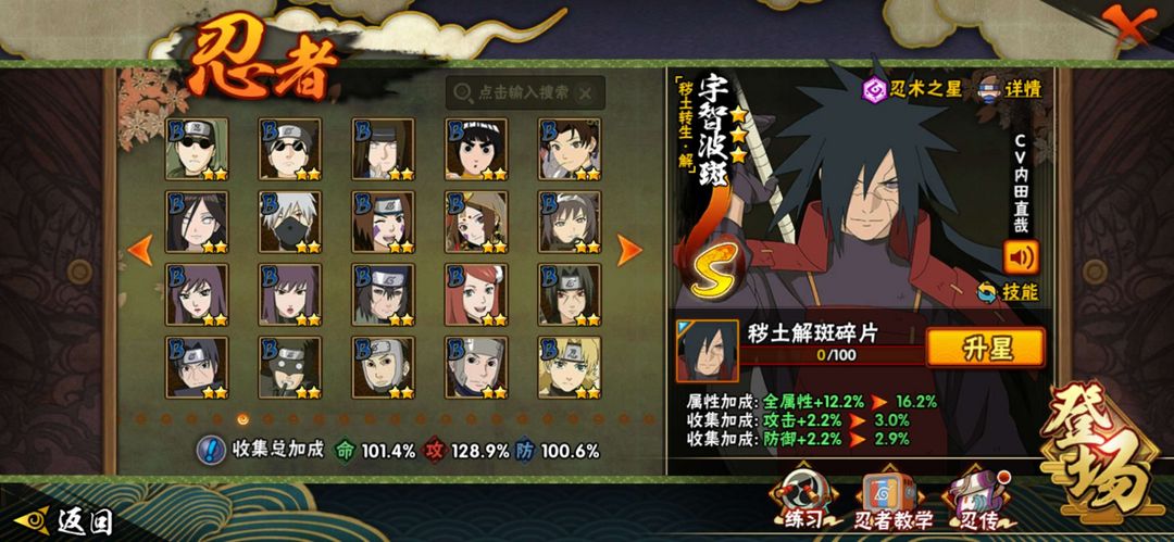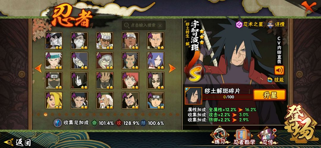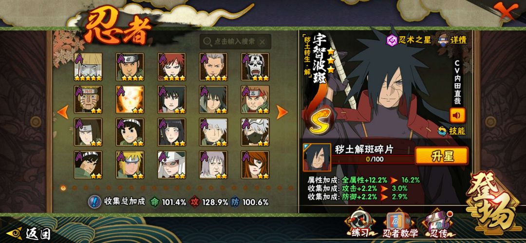 最热门忍者清单 S忍(决斗场&高人气) 宇智波斑[秽土转生·解]✨ 千手柱间[秽土转生]✨ 波风水门[秽土转生]✨ 宇智波鼬[秽土转生]✨ 自来也[舞之豪杰]✨ 自来也[传说中的忍者] A忍(决斗场热门) 波风水门[青年]✨ 宇智波鼬[新春限定]✨ 旗木卡卡西[忍界大战]✨ 蝎[百机操演]✨ 请游戏局内保持文明,防止禁言影响他人游戏,祝您玩得愉快!