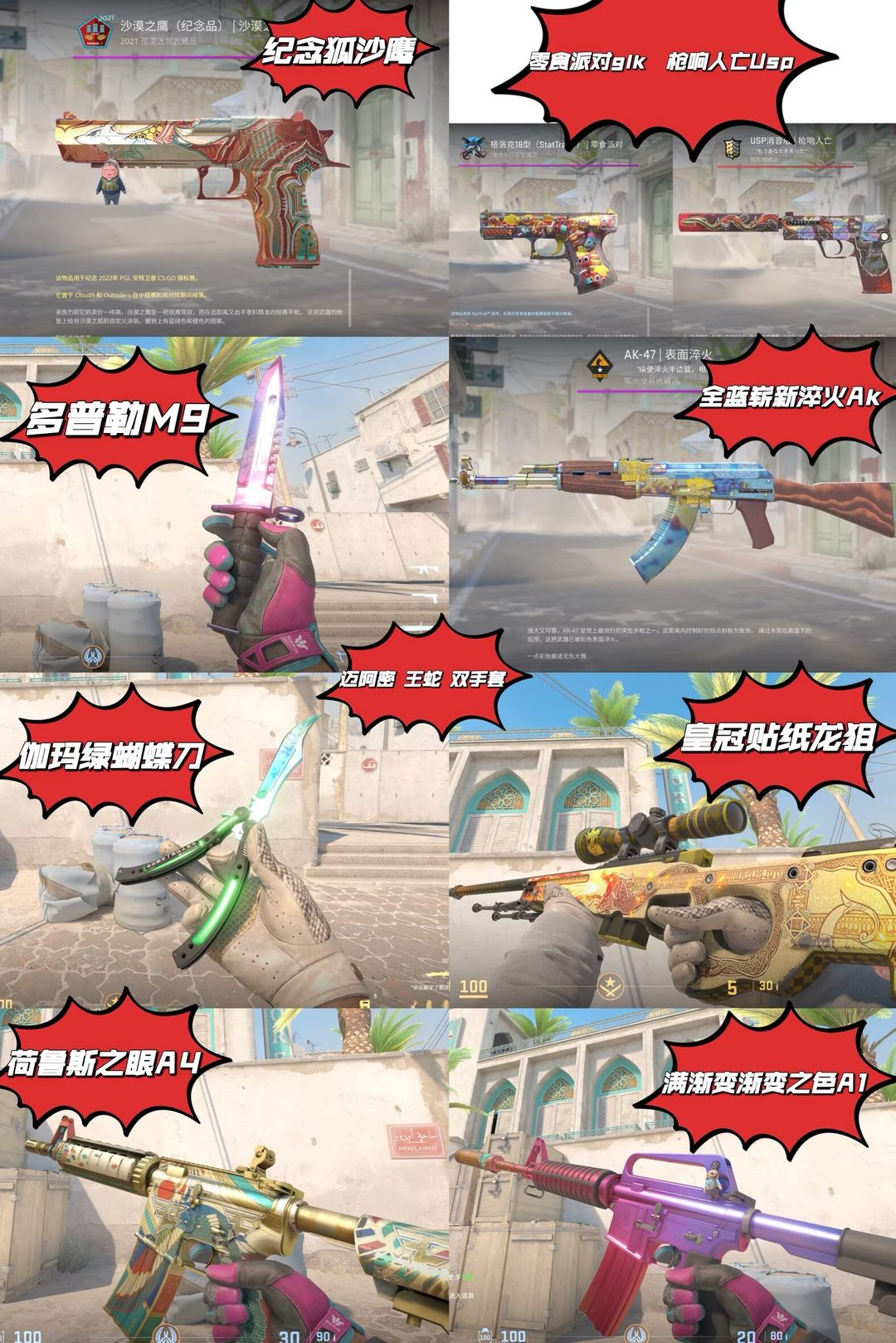 5E完美B+双手迈阿密+王蛇❤️皇冠龙狙❤️双刀伽玛蝴蝶多普勒M9❤️全蓝淬火Ak❤满渐变A1荷鲁斯